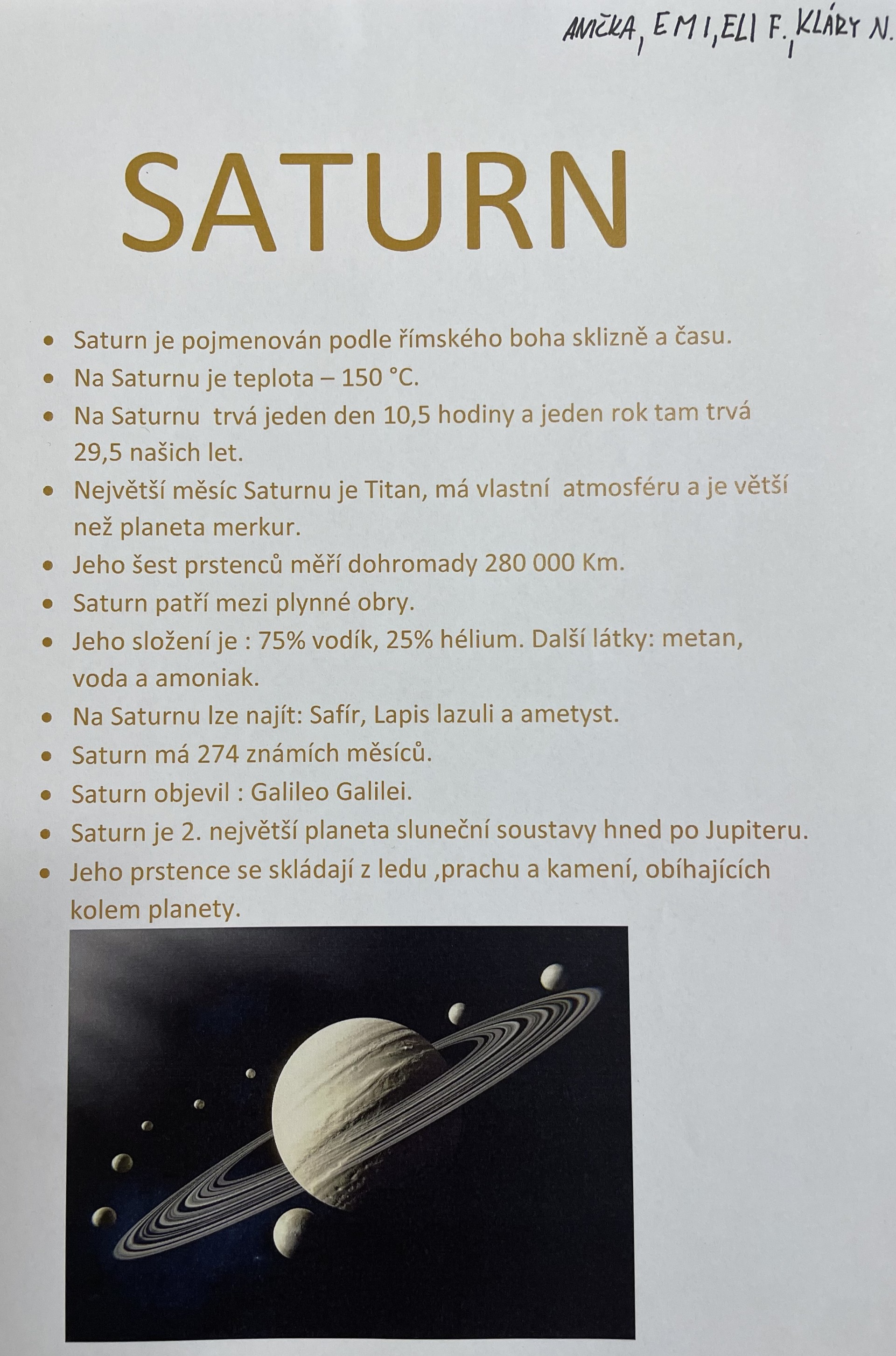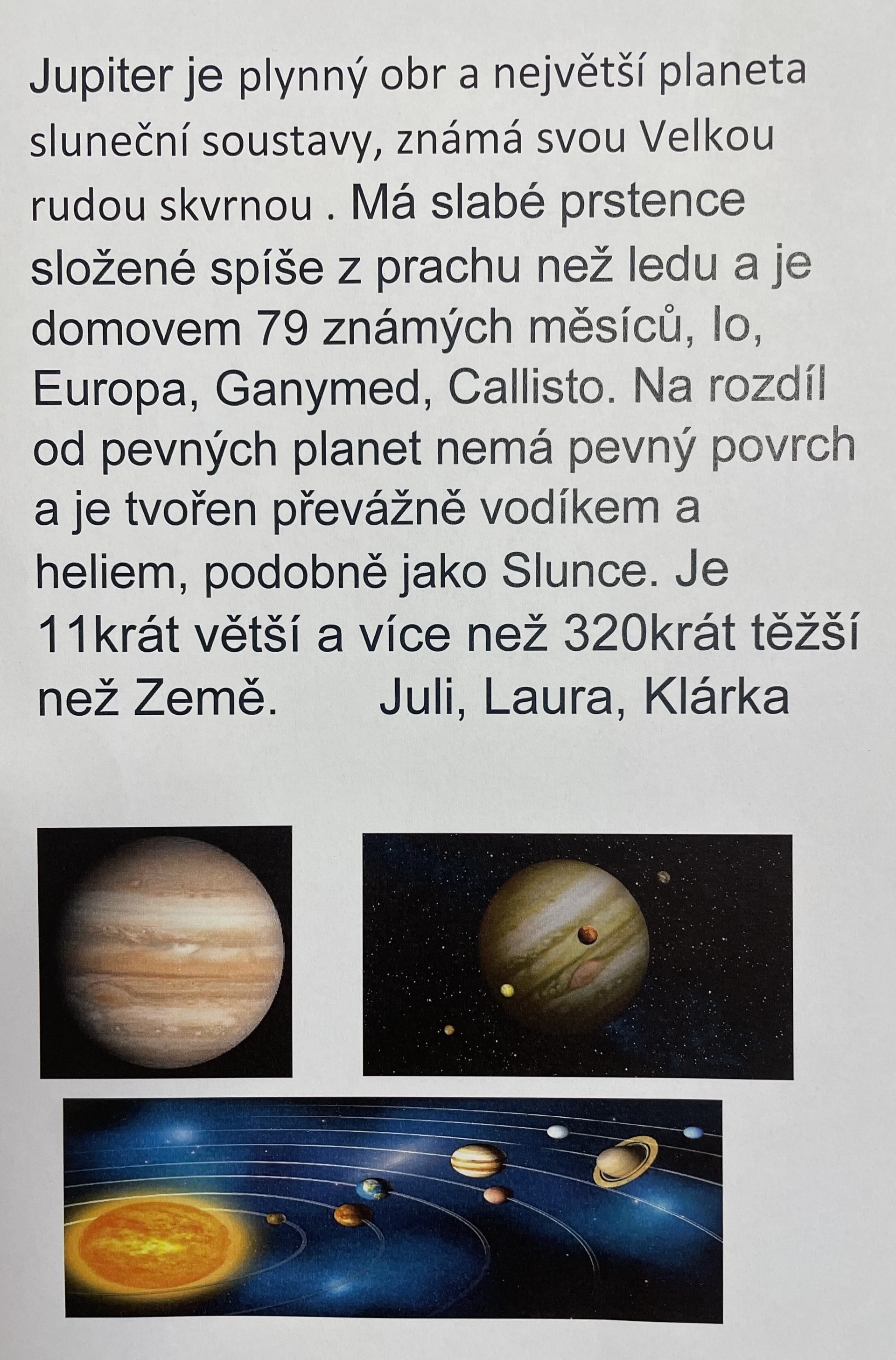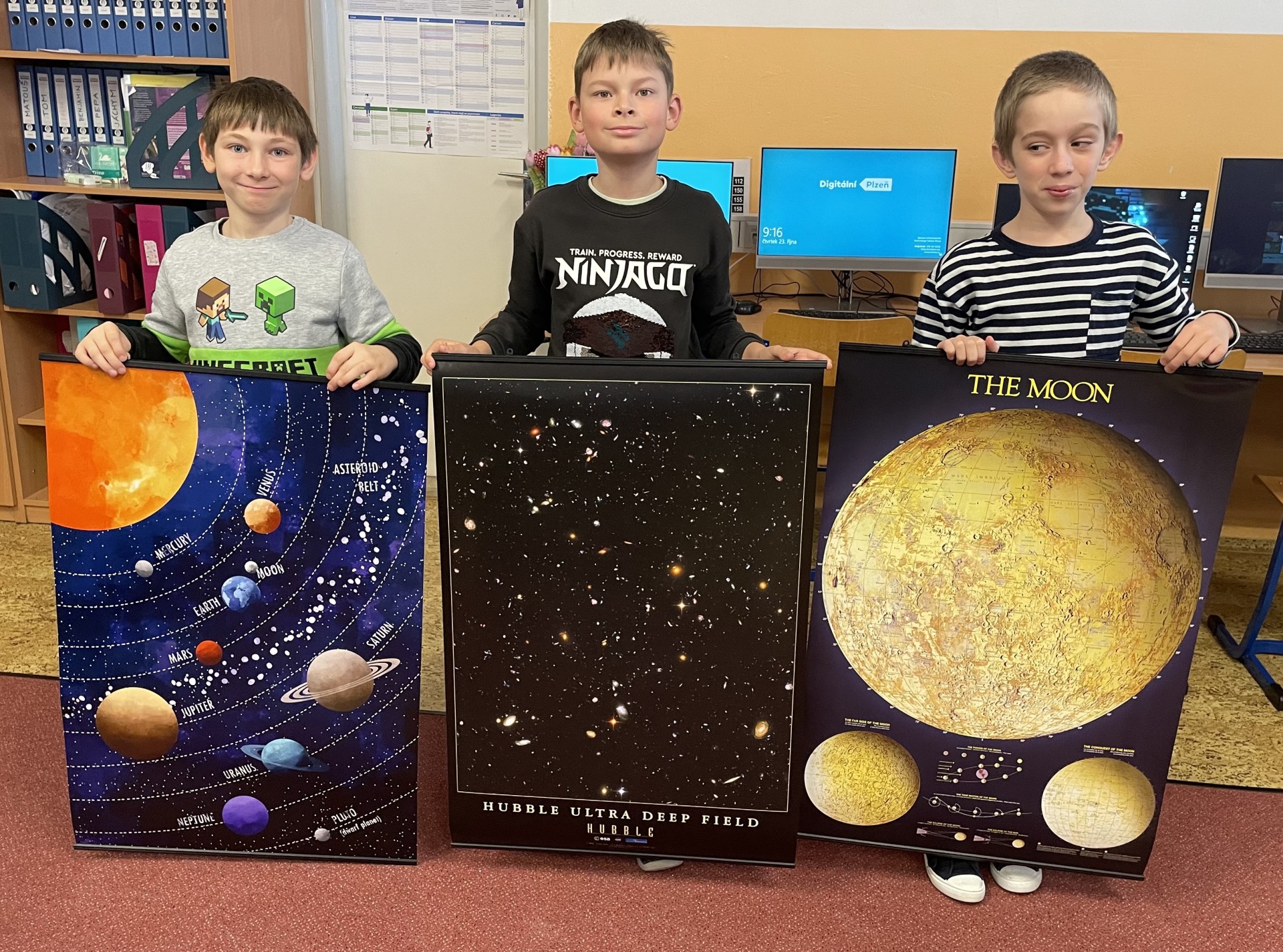 Při přírodovědě jsme se dostali ke krásnému tématu VESMÍR. Páťáci se do toho vrhli po hlavě a donesli spoustu zajímavostí, aktualit, obrázků a tipů na filmy a dokumenty. Jednotlivé skupinky si vylosovaly planetu, o které pak děti samostatně zjišťovaly informace a zpracovaly téma na počítačích. Též jsme si v tomto duchu vyzdobili třídu. Výsledky si prohlédněte v naší galerii.