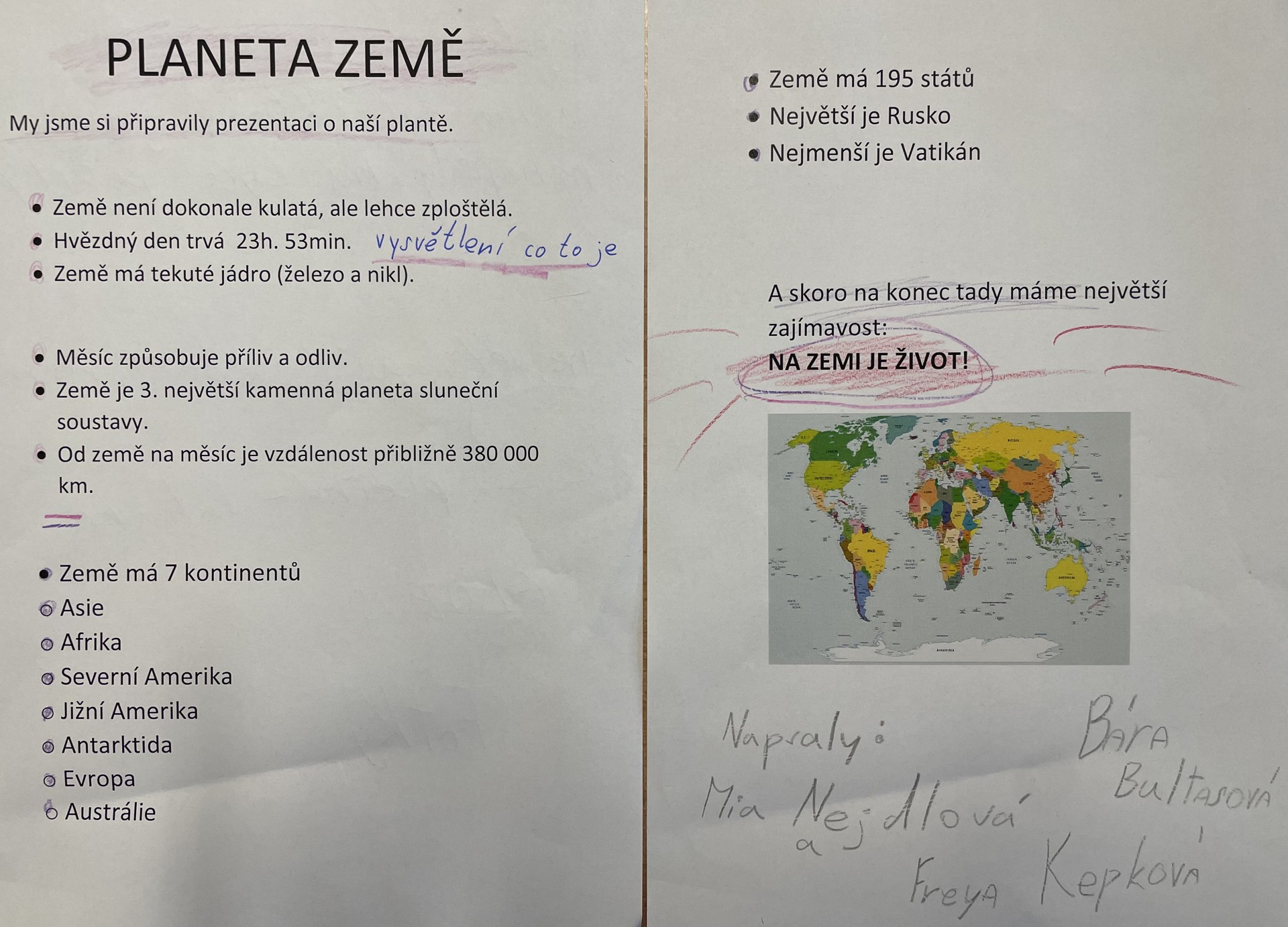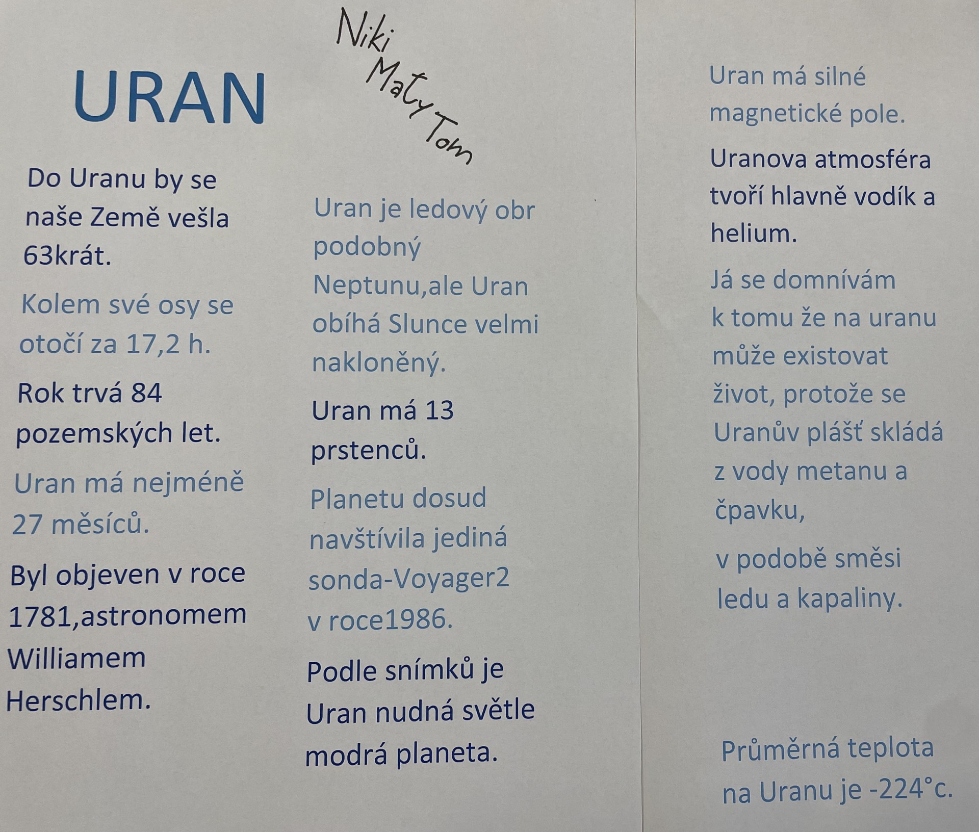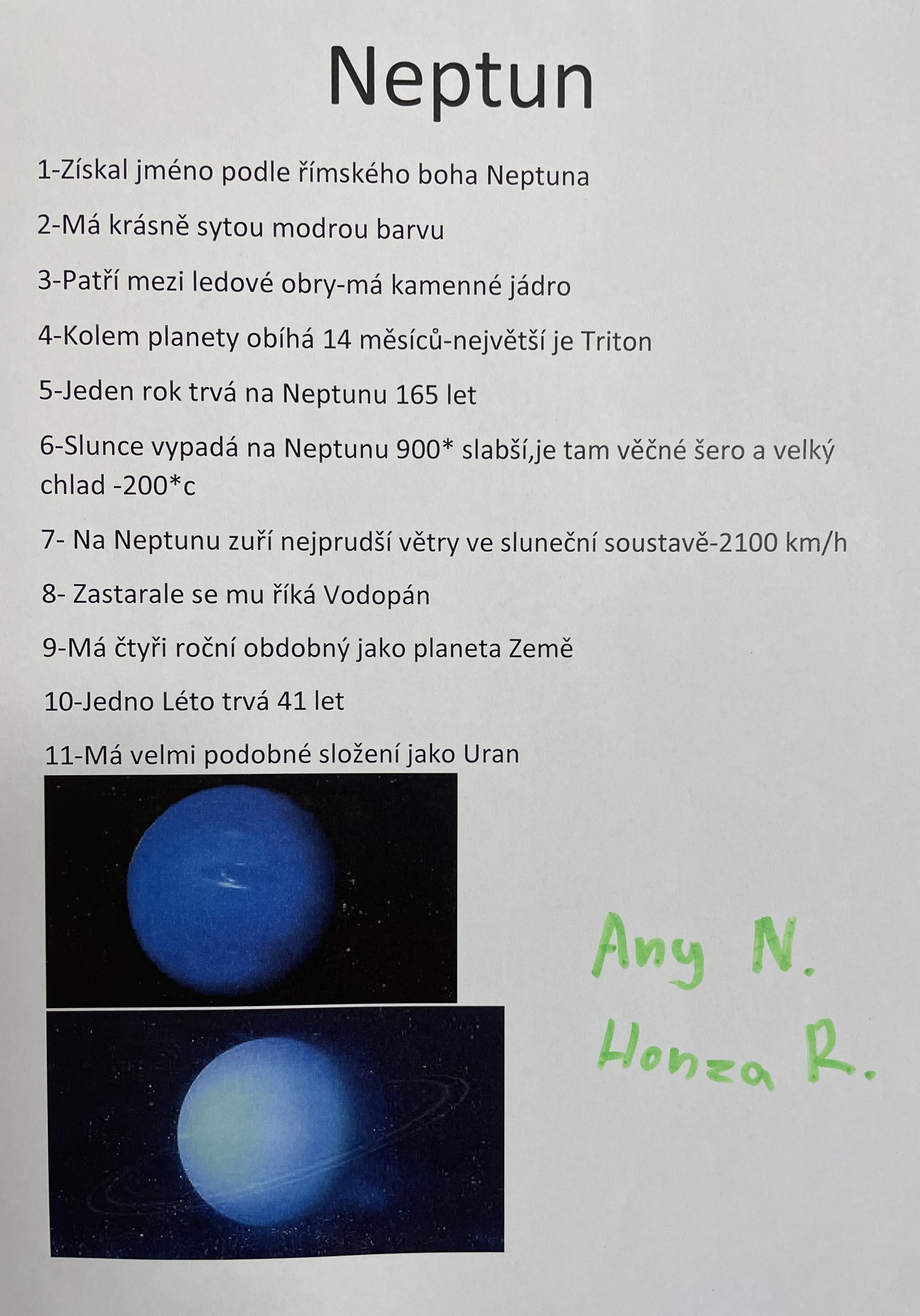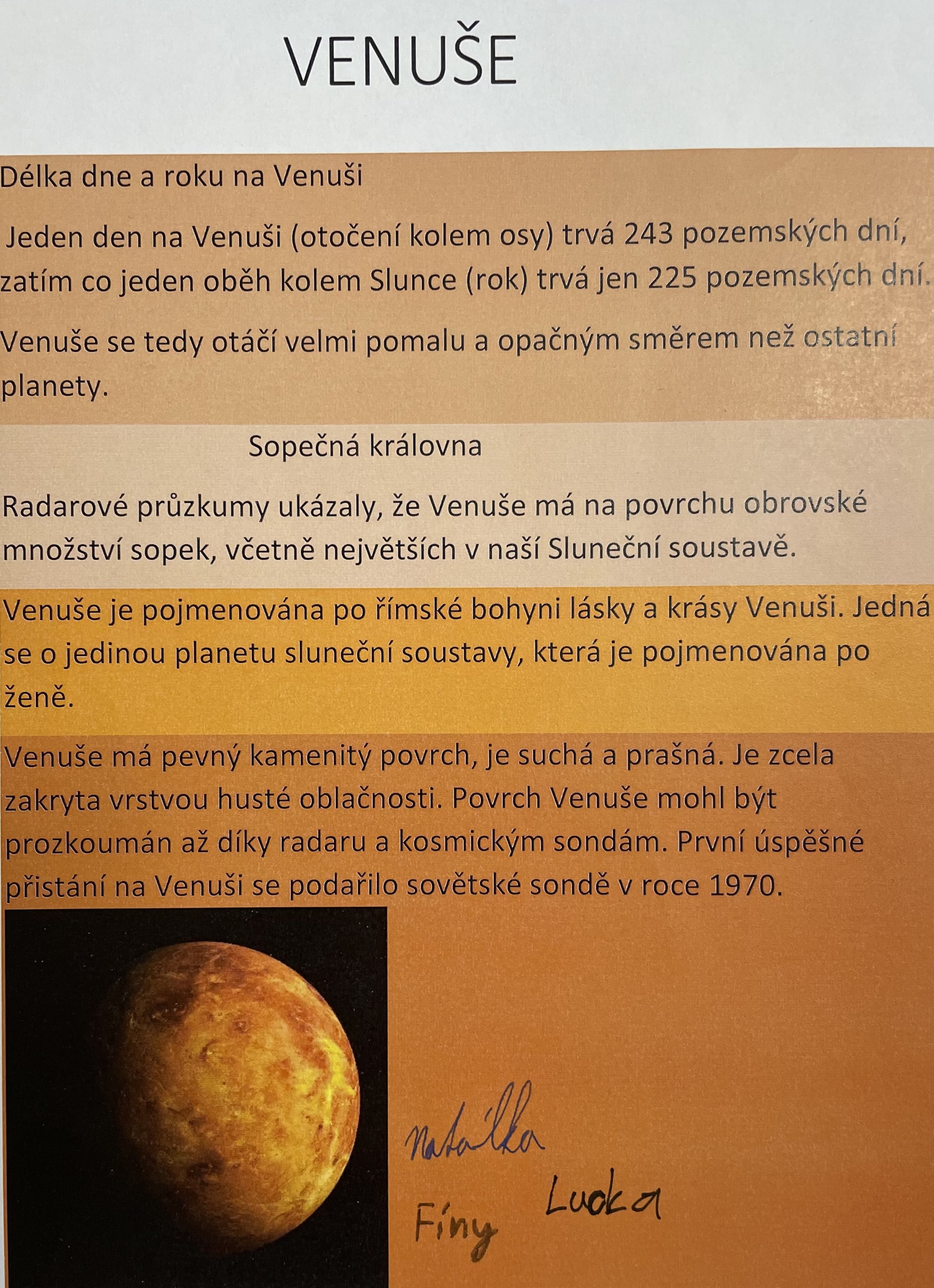 Při přírodovědě jsme se dostali ke krásnému tématu VESMÍR. Páťáci se do toho vrhli po hlavě a donesli spoustu zajímavostí, aktualit, obrázků a tipů na filmy a dokumenty. Jednotlivé skupinky si vylosovaly planetu, o které pak děti samostatně zjišťovaly informace a zpracovaly téma na počítačích. Též jsme si v tomto duchu vyzdobili třídu. Výsledky si prohlédněte v naší galerii.